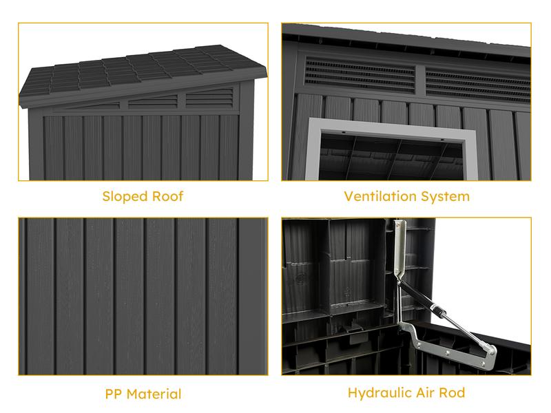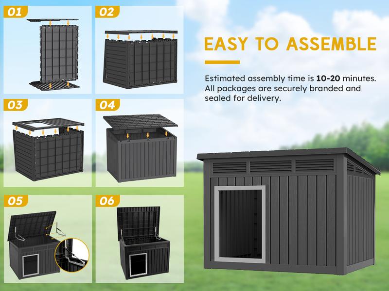 The hinged roof smoothly opens with hydraulic gas struts on both sides. Constructed from high-quality PP (polypropylene) material, it ensures secure support and stable operation even under impact. This robust mechanism enhances the kennel's longevity and safety, providing reliable shelter for your pet. Dimensions: 43.7" L x 34.45"W x 7.01"H.